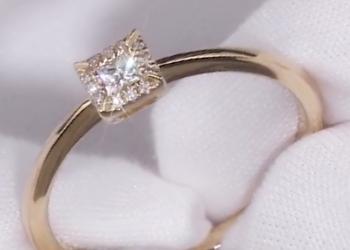 Новое кольцо из желтого золота 585 пробы, вставки: 1 бриллиант 0,1 карата, 12 бриллиантов 0,03 карата. Размер 17,5.